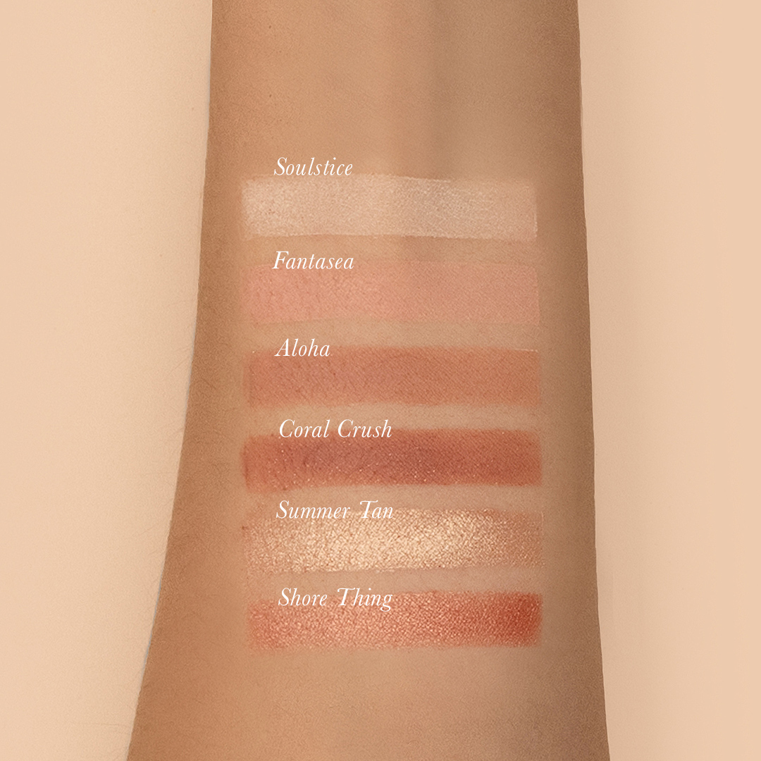 Have the softest gaze in the room with the delicate shades of TOUJOURS Peach Palette: Soulstice, Fantasea, Aloha, Summer Tan, Coral Crush, and Shore Thing.